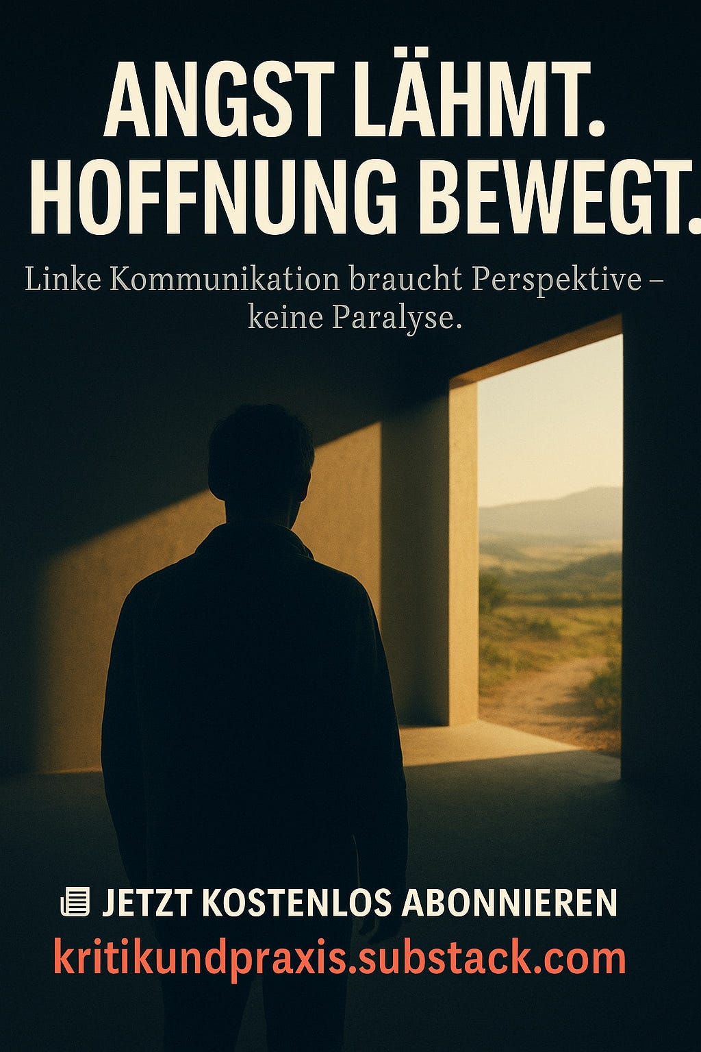 Eine der provokantesten Einsichten des Buchs lautet: Angst funktioniert schlechter als Hoffnung. Auch das widerspricht linken Traditionen, die sich gern in Krisenprognosen üben – vom ökologischen Kollaps bis zur kapitalistischen Totalität. Doch Apokalypse paralysiert. Wer nur zeigt, wie schlimm alles ist, liefert bestenfalls eine intellektuelle Depression. Was fehlt, ist die Perspektive: Was kann ich tun? Wo kann ich wirken? Wofür lohnt sich Kampf noch?
