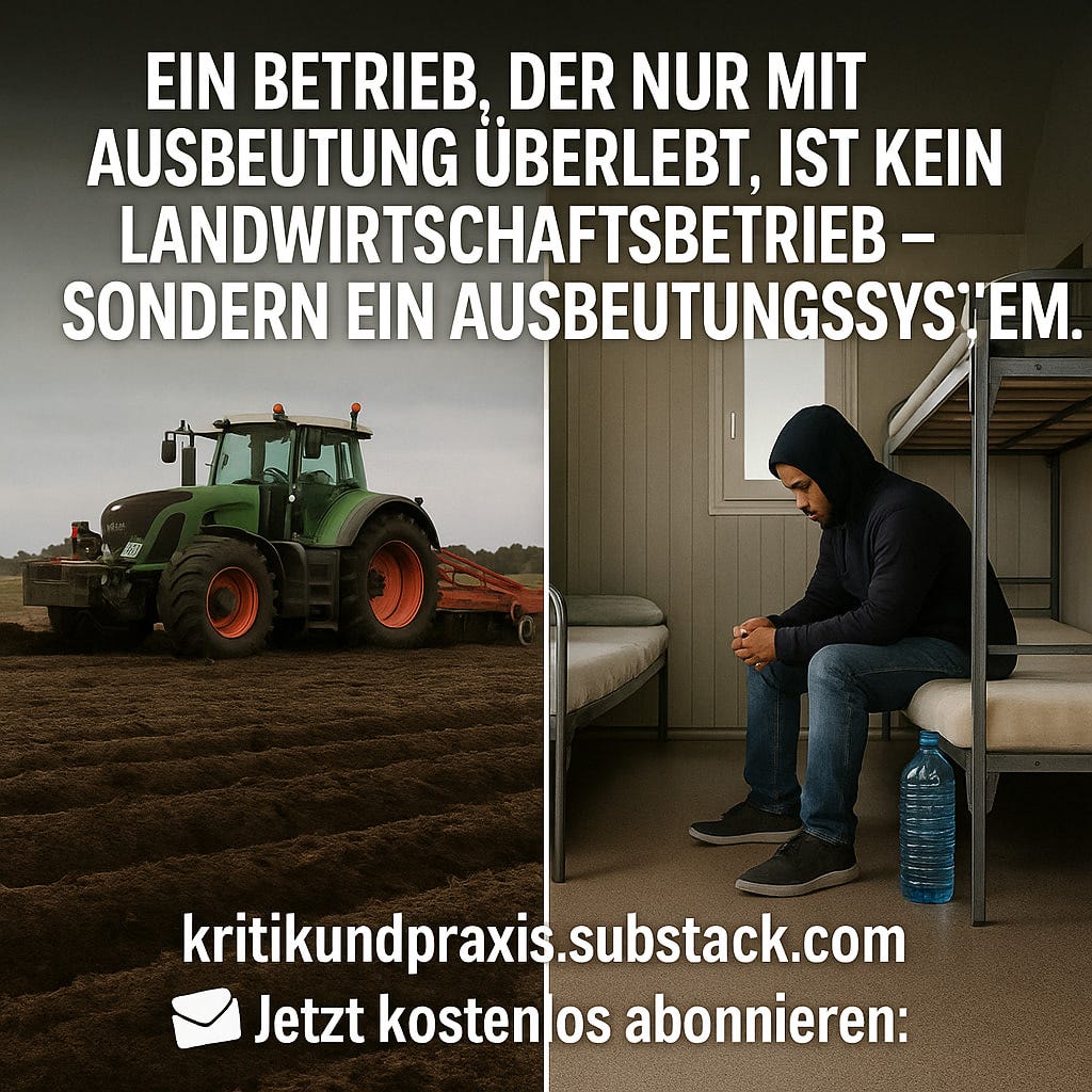 Der Deutsche Bauernverband fordert, Saisonarbeiter:innen künftig nur noch 80 Prozent des gesetzlichen Mindestlohns zu zahlen, also die geplante Erhöhung auf 15 Euro nicht zahlen müssten. Bundesagrarminister Alois Rainer (CSU) zeigt sich offen. Seine Fachleute prüfen, ob sich das rechtssicher umsetzen lässt. Was hier als „Sorge um den Agrarstandort“ verkauft wird, ist in Wahrheit der Versuch, staatlich garantierte Überausbeutung zu legalisieren.