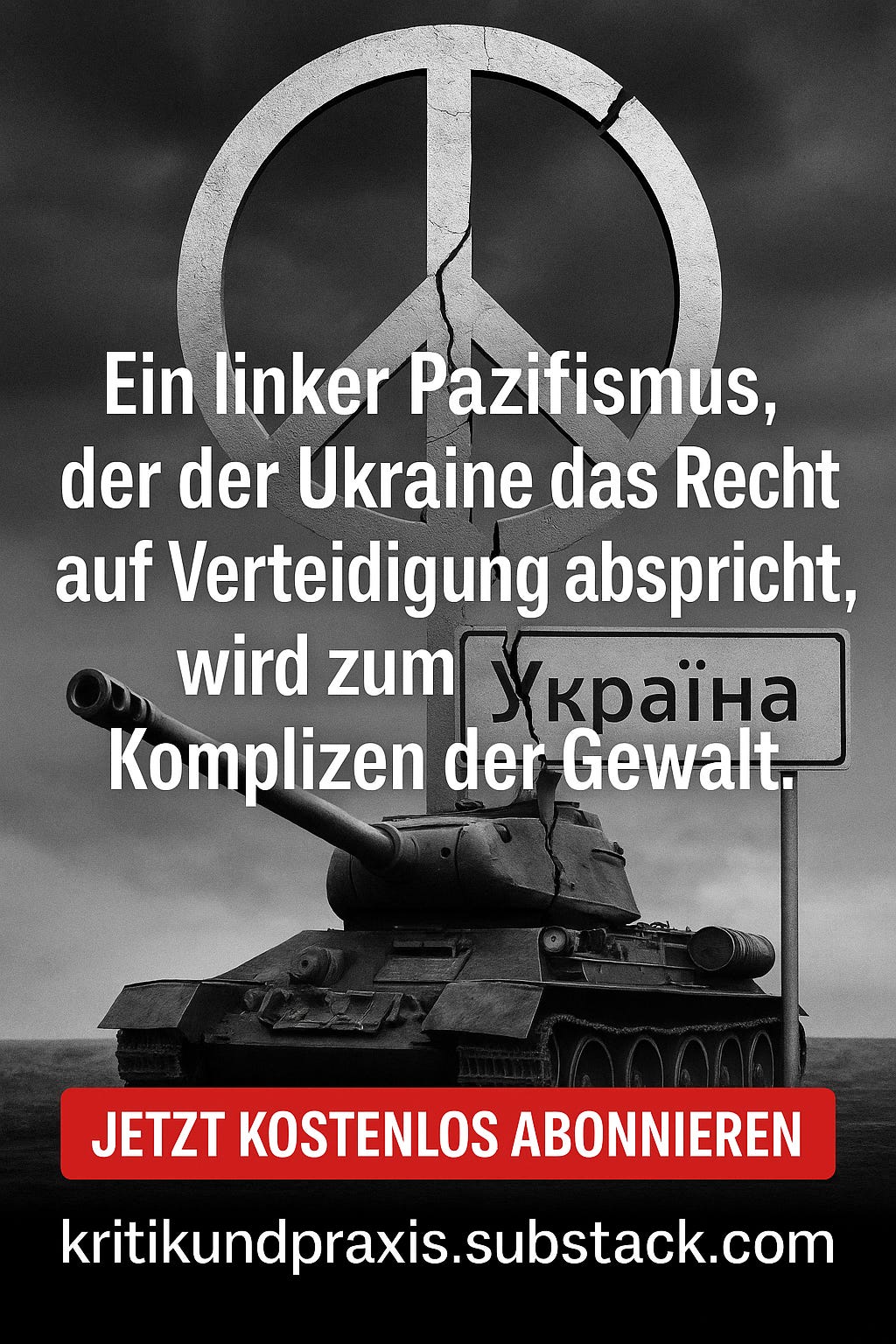 Ein ernst gemeinter linker Internationalismus aber muss das Gegenteil tun: Er muss anerkennen, dass es Situationen gibt, in denen militärischer Widerstand legitim, ja notwendig ist – gerade wenn eine imperiale Macht versucht, ein Nachbarland zu vernichten. Wer Waffenlieferungen pauschal ablehnt, verweigert der Ukraine nicht nur die Solidarität, sondern auch das Vertrauen in ihre politische Urteilskraft. Das ist nicht pazifistisch – das ist paternalistisch.