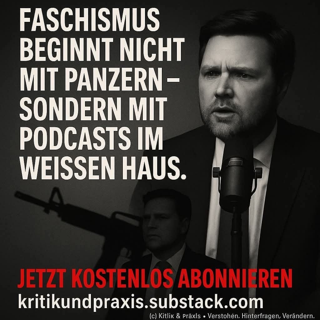 Denn autoritäre Regime und Faschismus beginnt nicht mit Panzern. Sondern mit Podcasts im Weißen Haus und der Androhung von Repression.