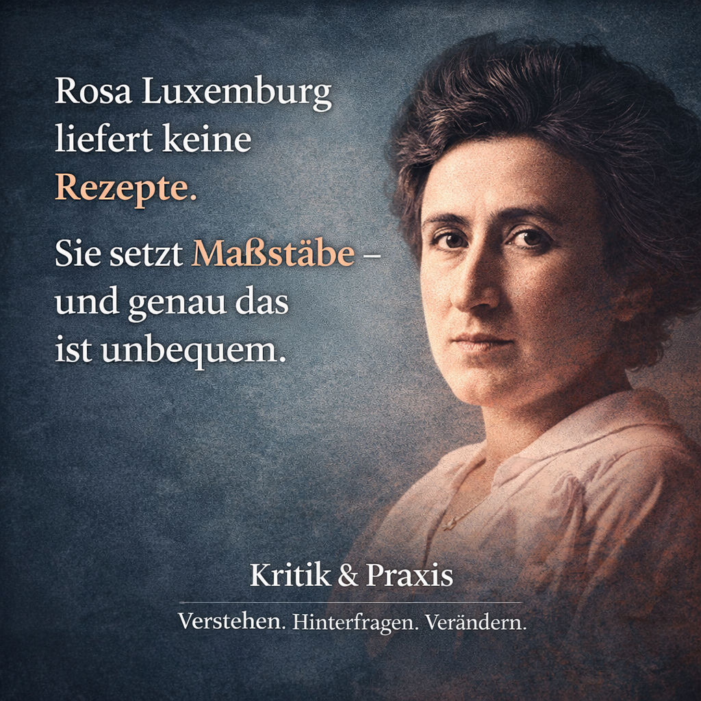 Rosa Luxemburg würde heute keine Rezepte liefern. Aber sie würde Maßstäbe setzen. Und diese Maßstäbe wären unbequem. Sie würden verlangen, Sozialismus nicht als Ziel jenseits der Gegenwart zu denken, sondern als Praxis im Hier und Jetzt.